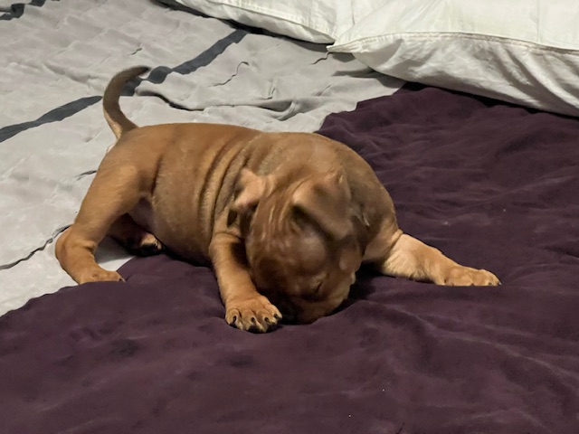 We feed a high-protein, grain-controlled diet formulated for bully breeds. Puppies transition to adult formulas around 12 months, with weight and body condition checks every four weeks.