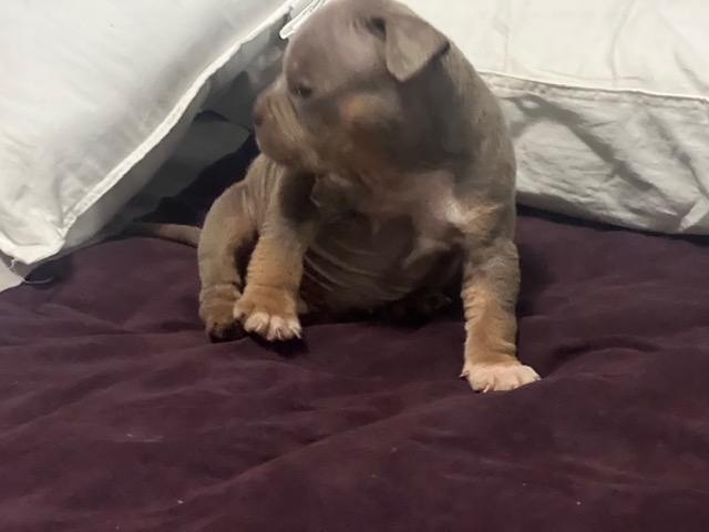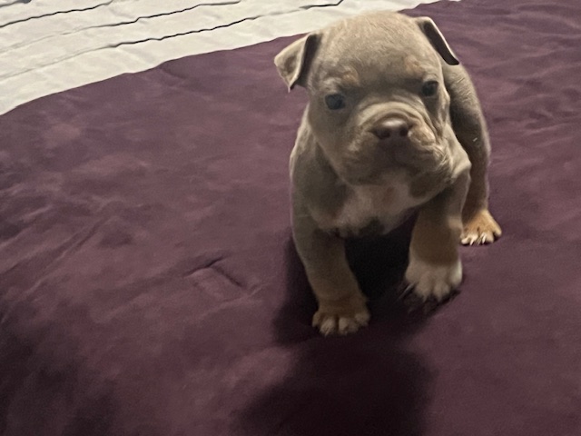 Introducing Ghost Reign, – Born, October 23rd 2025 – one of the most eye-catching males from our elite Icon × Bella breeding. This powerful Lilac Tri Micro Male brings an unforgettable look—icy tri points, compact frame, thick bone, and the bold headpiece Capcity Bullys is known for producing.
